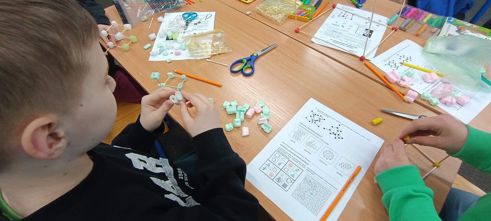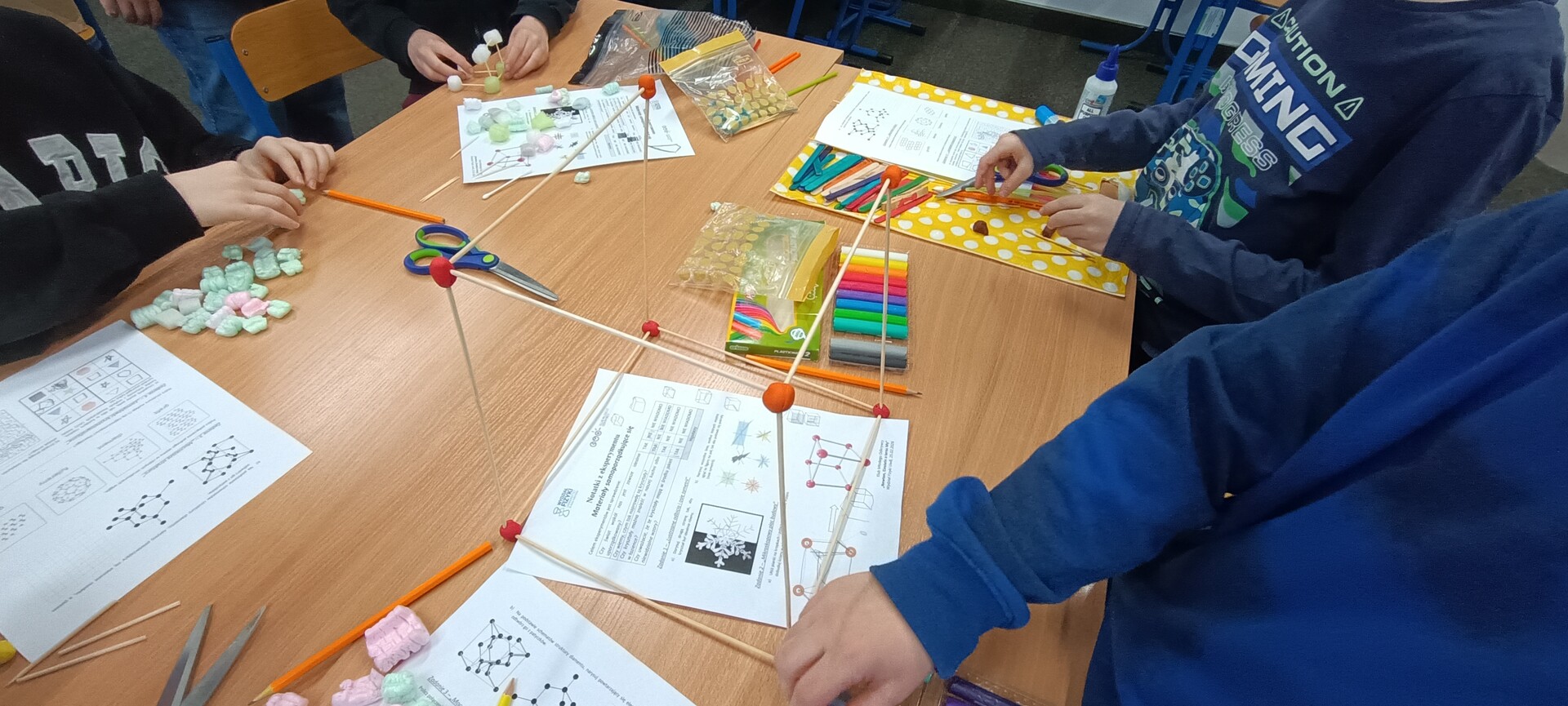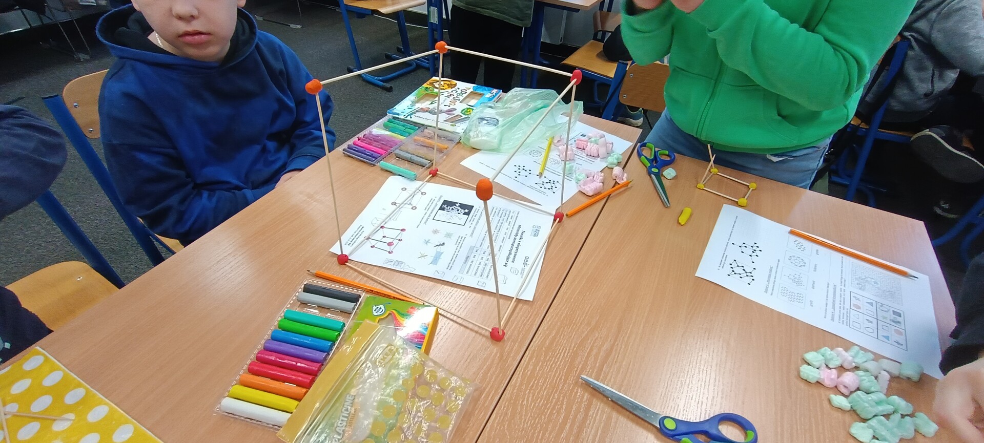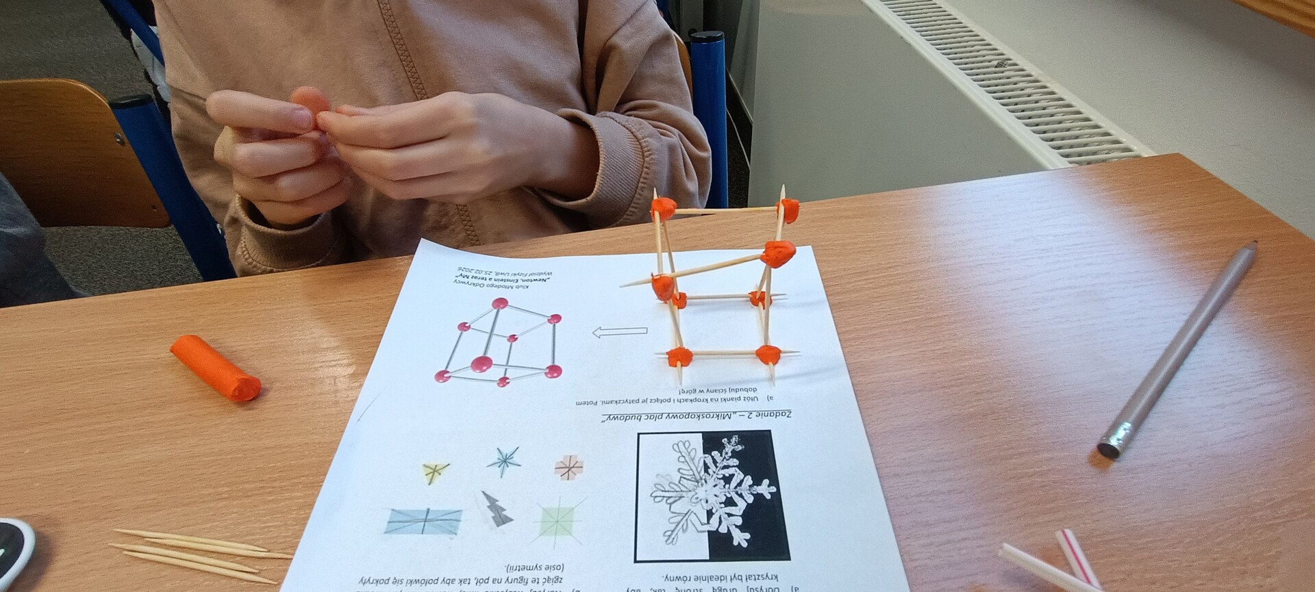 Po rozpoznaniu tych charakterystycznych wzorów, KMO-wcy próbowali odtworzyć je, stosując proste elementy symetrii. Korzystając z pianek i plasteliny (jako obiektów powielanych w przestrzeni) oraz patyczków i drucików miedzianych (jako wiązań), nasi „architekci molekularni” odkrywali reguły translacji, odbicia i obrotu. Mieli też okazję przeanalizować wewnętrzną strukturę pospolitych minerałów - od tych najtwardszych, po najbardziej kruche.